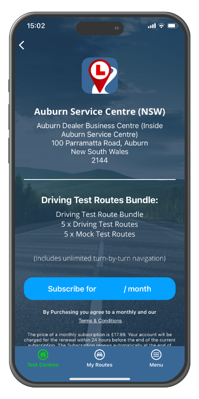 Subscription: Your subscription includes unlimited access to all test routes available for your chosen Service Centre. All test routes come with unlimited turn-by-turn navigation.